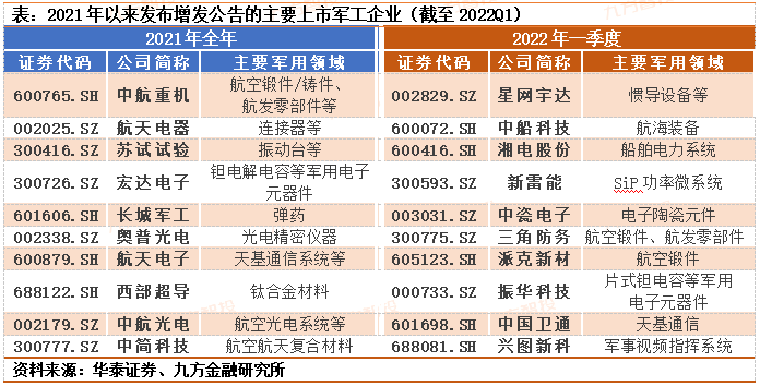 一方面,就体系内单位而言,随着核心主机单位的新产能逐步达产,中上游环节单位的扩产需求集中凸显。据机构统计,纵观2021年,A股共有10家上市军工企业公告了再融资计划;