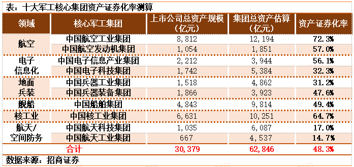 其次,由于我国国防军工行业的自身独特属性,国内军工整体资产证券化率提升空间一直十分可观。根据机构测算,当前我国核心军工资产证券化率仍只有48%左右;其中,涉及航天与空间防务领域的核心资产证券化率远远低于其他领域。