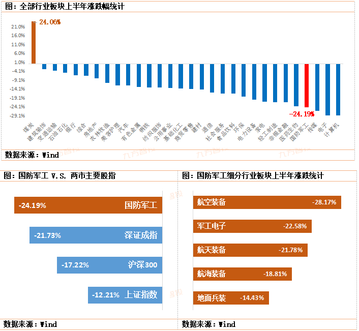 回顾上半年,军工一反多年以来的高景气赛道白马的形象,板块整体明显走弱。就板块走势而言,申万国防军工指数截至端午节前整体较开年回落24.19%;同期上证指数跌幅为12.21%,深成指跌21.73%,沪深300回落17.22%。