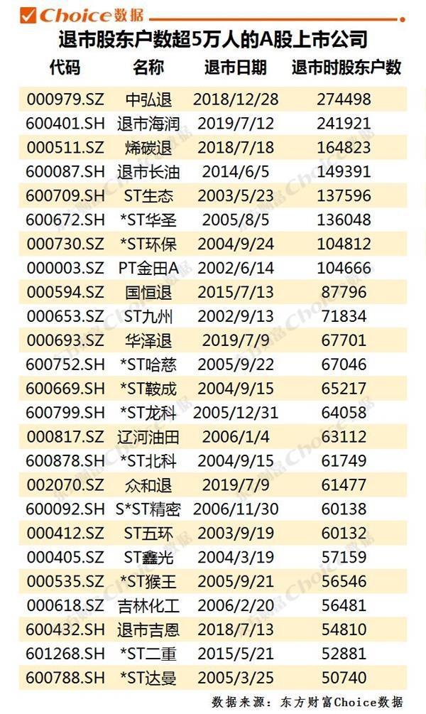 2018年12月28日退市的中弘退,退市时股东户数超27万,2019年7月12日退市的退市海润,股东户数也超过24万。