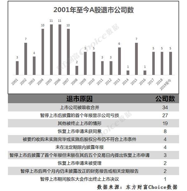 东方财富Choice数据显示,2001年以来,A股一共有104家公司退市,2006年,退市率0.91%达到高峰,2014年0.04%的退市率达到低谷。