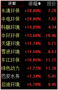 早盘环保板块大幅拉升,万得环保指数上涨2.61%。永清环保、科融环境、中电环保封于20%的涨停板。中环环保、天壕环境、雪浪环境等涨幅超10%,东江环保涨停。