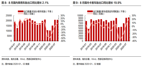 从出口角度来看,海外生产恢复速度落后于海外需求复苏速度。自6月起,中国轮胎出口由利空转向利好,8月国内乘用车和卡客车车胎出口量于疫情后首次实现同比正增长,国内轮胎直接出口转暖。