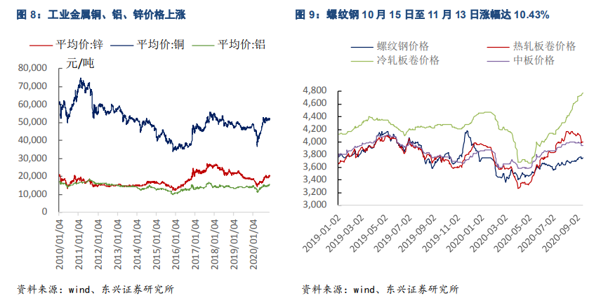 截止2020 年 11 月 13 日,工业金属铜、铝、锌的价格分别达到 52025 元/吨、15650 元/吨、20000 元/ 吨,创下 2018 年以来新高。螺纹钢价格达到 4200 元,处于 2019 年底以来的新高水平。