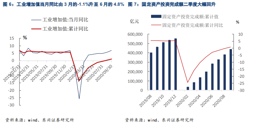 从我国的恢复情况看,二季度我国疫情已基本上在全国范围内得到控制,经济复苏斜率处于年初以来最大值,工业增加值当月同比由 3 月的-1.1%回正至 6 月的 4.8%,固定资产投资完成额累计同比由 3 月的-16.1%迅速回 升至 6 月的-3.1%。