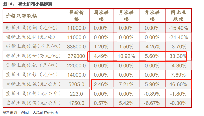 2)稀土价格小幅修复。氧化钕、氧化铽、氧化镨、氧化镝分别回升4.5%、2.5%、1.2%、0.6%,新能源汽车永磁电机拉开需求高增长序幕,下游补库带来轻重稀土价格仍有望联动回升。碳酸锂持续上行。上周小金属中碳酸锂、钼、钨价分别上涨2.4%、1.4%、1.2%。