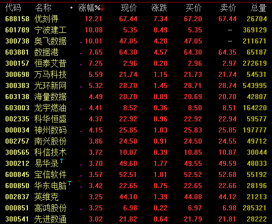 受政策利好刺激,IDC概念6日盘中发力上扬,截至发稿,宁波建工、奥飞数据涨停,数据港、恒泰艾普涨幅超7%,万马科技、光环新网涨幅超5%。