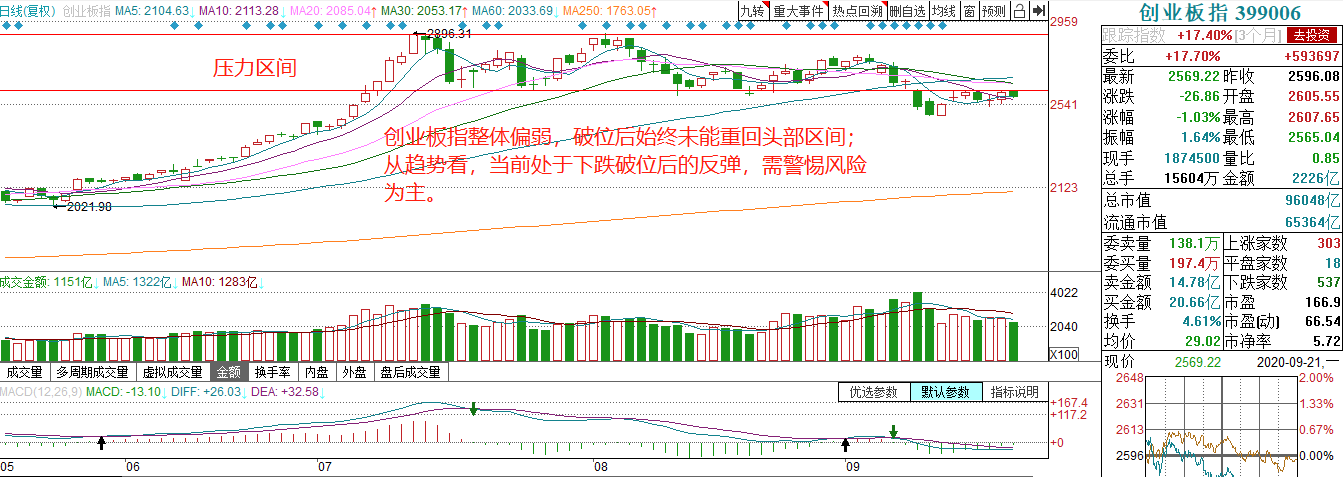 创业板当前走势明显弱于上证指数,9月9日平台破位后,指数一直未能重回头部区间。从趋势上看,创业板属于下跌破位后的反弹,需要警惕其成为下跌中枢。