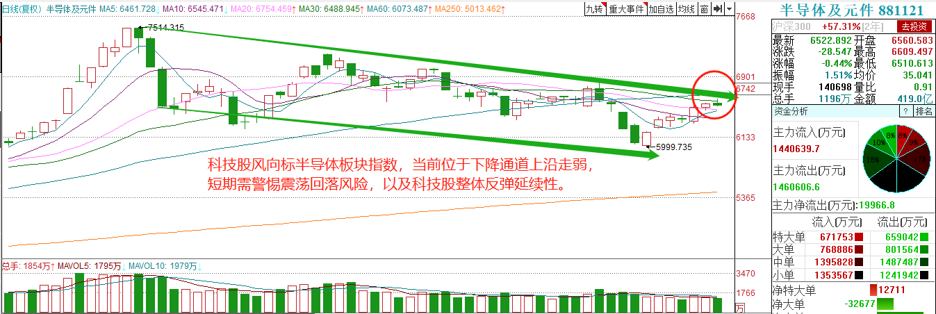 科技股此前普遍伴随创业板指破位下杀后修复性反弹,当前周期已达7个交易日。从我们之前介绍的半导体板块指数来看,其中期位于下降通道,而近几日的反弹使其触碰上方压力,从当前力度看有走弱趋势,需警惕区间回落风险。