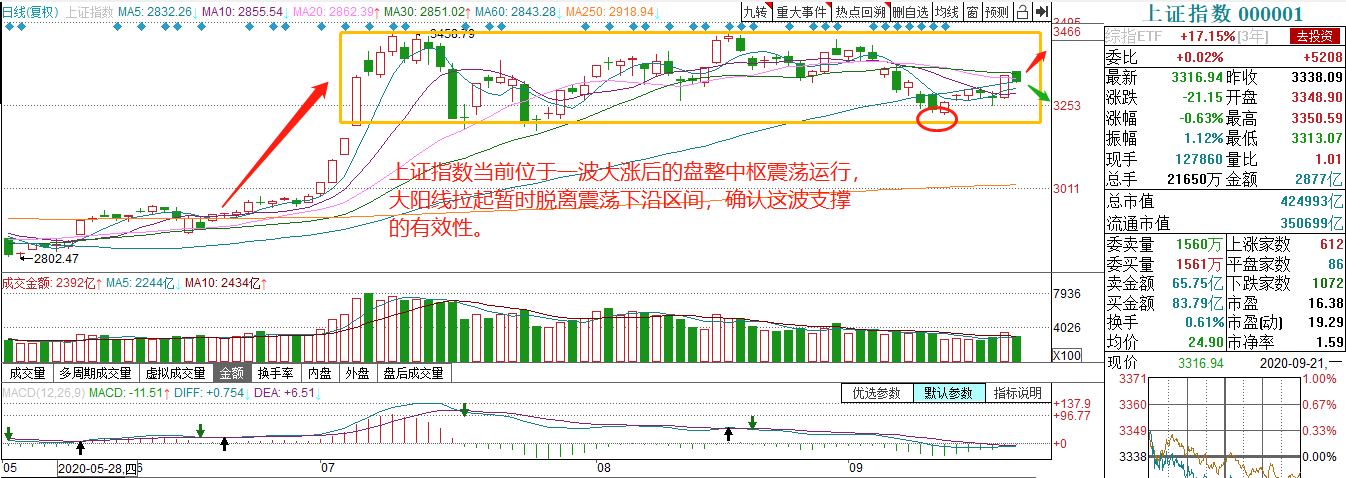 上证指数当前位于一波大涨后的盘整中枢震荡运行,周五的大阳线二次确认了这一波震荡下沿支撑的有效性,并未改变上证指数中期盘整震荡的运行趋势,短线上可上可下。周五的阳线量能同样有限,无论从趋势上还是量能上,都远没达到改变信仰的地步,股友们还是按照震荡市来做。
