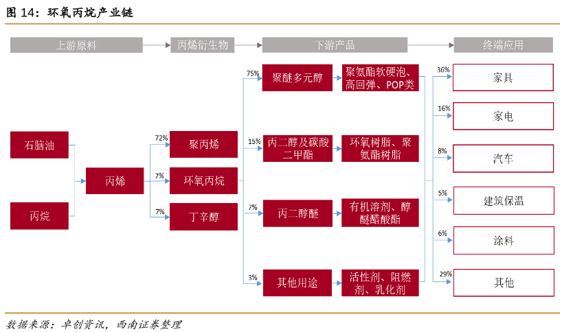 我们不需要记环氧丙烷产业链中各种复杂的中间体名称,了解一下下游终端应用即可。环氧丙烷的衍生物在汽车、建筑、食品、烟草、医药及化妆品等行业应用广泛,是精细化工产品的重要原料。家具、家电、汽车是目前最大的三大终端应用。
