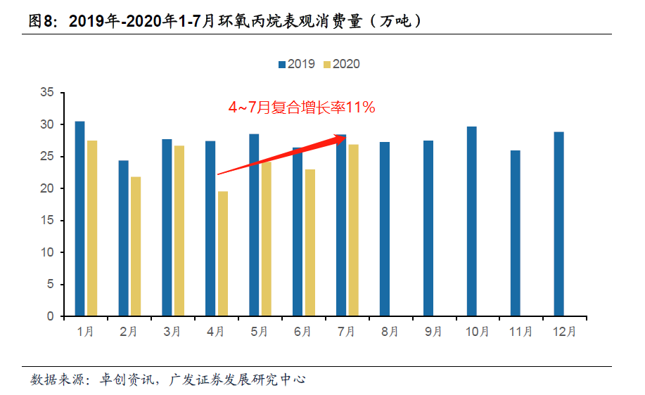 根据卓创资讯数据,受疫情影响,2020年1-7月份国内环氧丙烷表观消费量约170万吨,同比下滑11.9%,但随着国内逐步恢复正常,二季度开始国内环氧丙烷的表观消费呈缓慢增加预期,4-7月份的复合增长率达到11%。