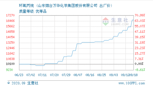 环氧丙烷价格自7月份快速上涨,价格飙涨超70%。目前环氧丙烷工厂仍无库存,新单仍较顺畅,市场行情延续涨势。
