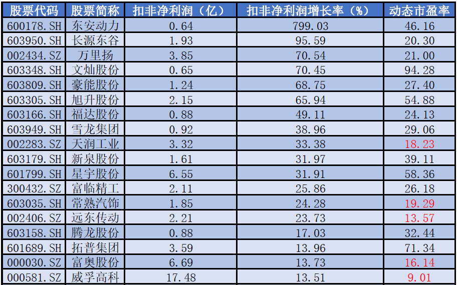 其中,东安动力、长源东谷、万里扬、文灿股份等扣非净利润增速位于前列,但值得注意的是东安动力和文灿股份等个股截止三季报净利润绝对值较低,仍小于1个亿;