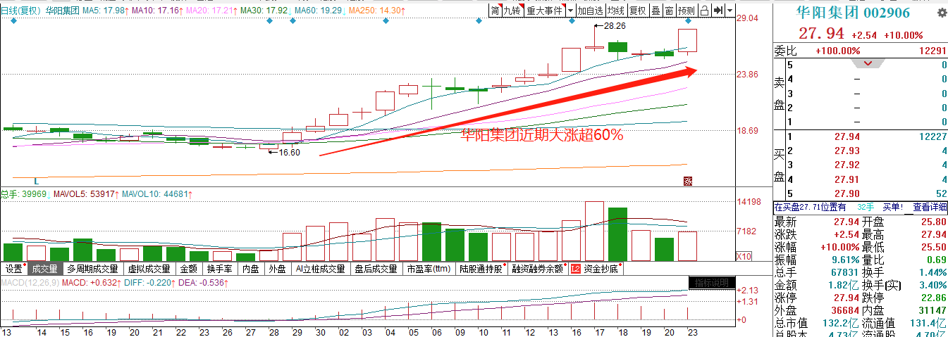 2)上游汽车零部件板块。华阳集团是国内优秀汽车电子标的之一,四大品类业务:汽车电子(63.03%,核心是智能座舱+ADAS),精密压铸(15.76%),精密电子部件(12.63%),LED照明部件(4.81%)。叠加智能汽车+无人驾驶利好,股价一路飙涨超60%。