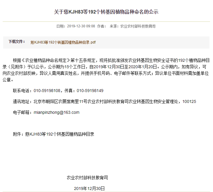 12月30日,农业农村部科教司发布公告,公示拟批准颁发农业转基因生物安全证书目录。共有192个植物品种,其中包括189个棉花品种、2个玉米品种和1个大豆品种。公示期为15个工作日,至2020年1月20日截至。如无异议,则两个转基因玉米事件有望获批安全证书。拿到安全证书以后,如果顺利通过品种审定,就可进入产业化种植。