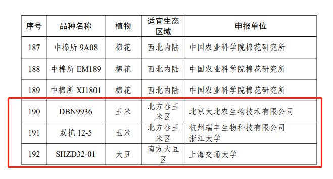 两个玉米品种和1个大豆品种将获得安全证书的信息引人关注:北京大北农生物技术有限公司的DBN9936抗虫玉米(转(Bt Cry1Ab)抗虫玉米)、杭州瑞丰生物科技有限公司和浙江大学的双抗12-5玉米(转Cry1Ab/Cry2Aj、G10evo(EPSPS)基因抗虫耐草甘膦玉米)用于北方春玉米区;上海交通大学的SHZD32-01抗草甘膦转基因大豆用于南方大豆区。