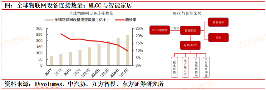 万物互联趋势下,终端的广泛应用推升MLCC需求。据GSMA预测,2025年全球物联网设备联网数量将达到约246亿个,20-25年CAGR为14%,万物互联成为全球网络未来发展的重要方向。MLCC由于其使用寿命长和固有的可靠性而成为物联网设备的理想解决方案。
