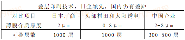 2)叠层印刷技术,日企领先,国内仍有差距:MLCC产品的电容量大小与内部堆叠层数呈正相关,在该过程中叠层印刷技术为关键核心。日本厂商普遍实现了在2μm,的薄膜介质上堆叠1000层厚度,制成1μm厚的100μF的MLCC;头部的村田和太阳诱电已研发出0.3μm的产品。
