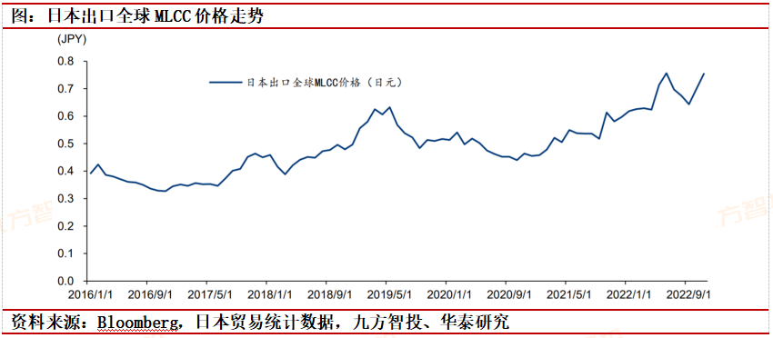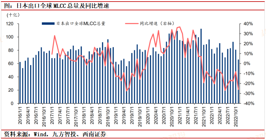 全球市场:根据日本贸易统计12月底披露的数据,日本对全球MLCC出口量在11月同比下降26%至661亿只,连续14个月同降;但11月日本MLCC出口价格(以日元计)同比抬升30%。