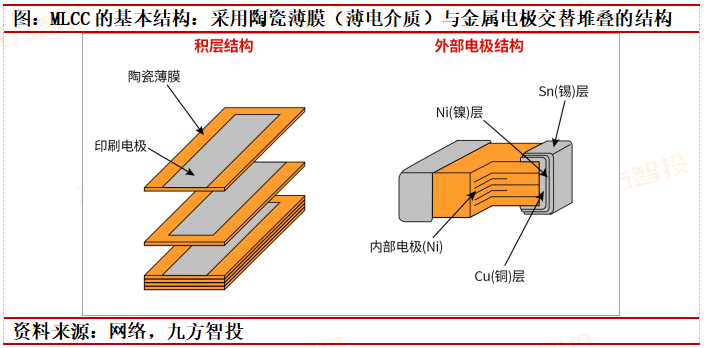 MLCC被称为“工业大米”,是被动元器件的细分黄金赛道。MLCC是将多层内电极在陶瓷介质膜片上以交错的方式排布并进行高温烧结,由外部封上金属层后形成的独立电容器;其主要结构由内电极、陶瓷层和端电极三部分组成。