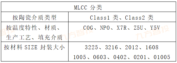 MLCC分类较多,一般有三种分类标准。按照所采用的陶瓷介质类型可分为Class1类、Class2类;按照温度特性、材质、生产工艺、填充介质可分为C0G、NPO、X7R、Z5U、Y5V;按照材料SIZE封装大小可分为3225、3216、2012、1608、1005、0603、0402、0201、01005等。