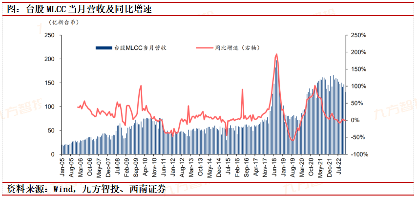 中国台湾进口日本MLCC价格(以日元计)在22年11月同比/环比增长4%/4%。从中国台湾MLCC厂商表现来看,继22年10月及11月台股MLCC厂商月度营收连续两个月同比转正以来,Wind数据显示台股MLCC12月营收为130.9亿新台币(-1.1%yoy)。