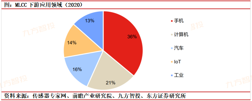 MLCC下游应用广泛,下游应用市场包括手机、计算机、汽车、IoT和工业等领域。其中,手机是MLCC最大的应用领域,占据36%的市场份额;汽车在MLCC中的终端占比约为16%。展望未来,MLCC行业不仅直接受益于5G建设的需求带动,而且会随着新能源汽车以及电子产品性能升级的蓬勃发展而长期向好。