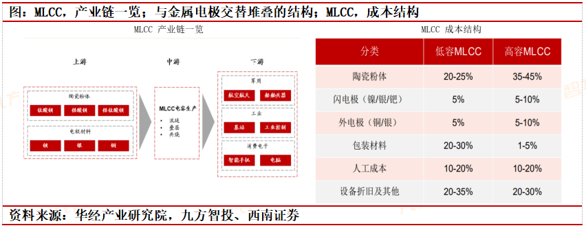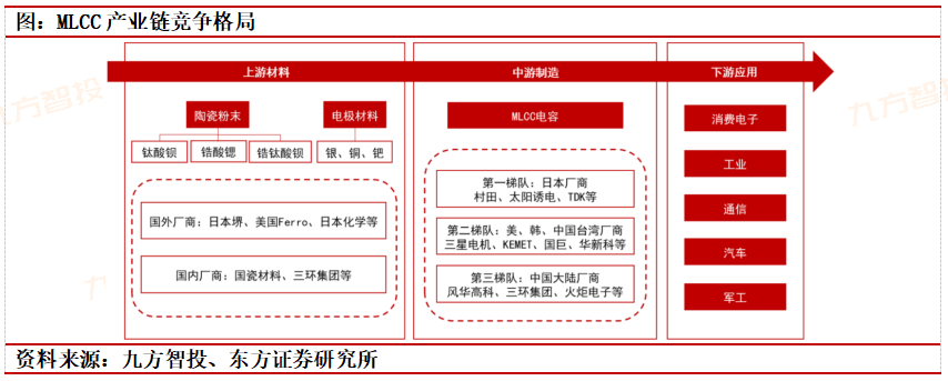 MLCC:行业技术壁垒较高,国内厂商正在加速突破核心技术。从产业链来看,MLCC产业链分为:上游陶瓷粉体和电极材料、中游元器件制造以及下游产品应用。其中,其核心壁垒主要有三点:上游原材料陶瓷粉料的配比,中游的MLCC叠层印刷技术、陶瓷成型的共烧技术。