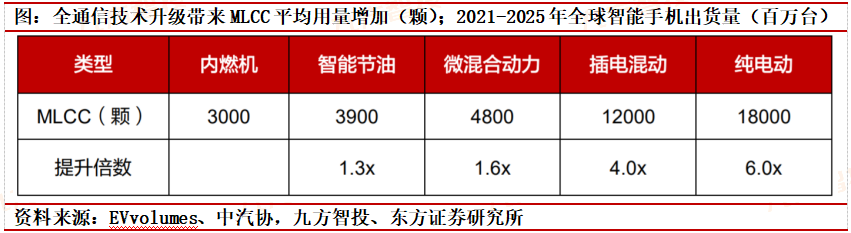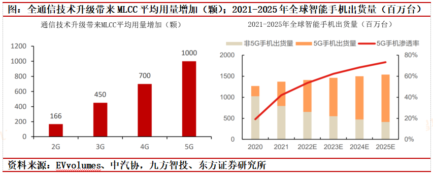 2)5G渗透率提升:根据IDC数据,2022-2025年5G手机年均复合增长率将达14%,预计2025年5G手机出货量占比将达70%以上。相比4G手机700颗MLCC左右的用量,5G手机MLCC的平均单机用量约为1000颗以上,MLCC单机用量大幅攀升。