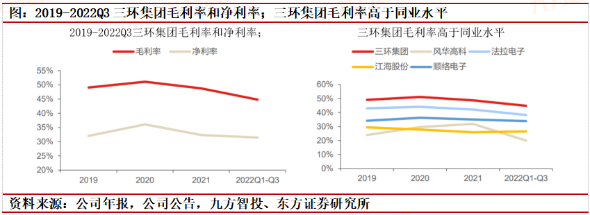 公司被评为国家高新技术企业、国家技术创新示范企业、中国制造业单项冠军示范企业,多年名列中国电子元件百强前十名。公司高容量MLCC产品已通过国内行业标杆客户的认证并实现小批量供货。公司毛利率、净利率保持稳定,且明显优于同业水平。2019-2021年公司毛利率均维持在50%左右,2022前三季度受外部环境影响略降至45%,历年净利率均在30%以上的较高水平。公司毛利率相较同行业对手,具备较强的竞争优势。