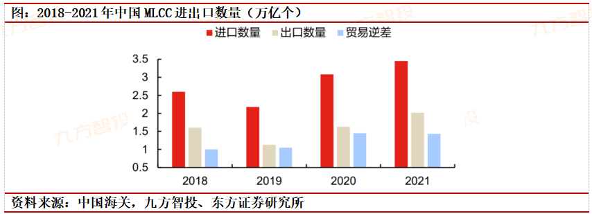 根据中国海关总署数据,2021年我国MLCC进口数量为3.5万亿颗,进口金额为97亿美元,2018-2021年MLCC贸易逆差由1万亿颗增长至1.4万亿颗,对外进口依赖度较高,进口替代空间大。2017-2020年我国MLCC进口平均单价均高于出口单价,表明我国MLCC进口产品主要集中在中高端领域,低端领域已实现规模化量产出口。