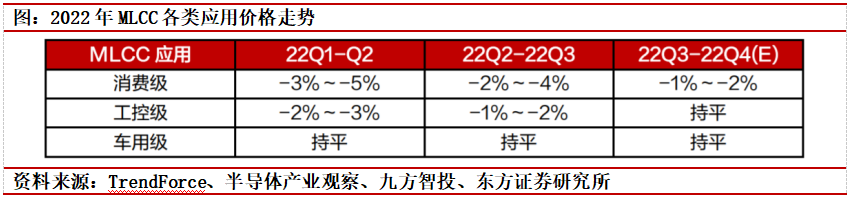 价格端:MLCC价格下行周期进入尾声。根据TrendForce数据,总体来看,MLCC各类应用价格跌幅持续收窄,下行周期已进入尾声,行业景气度有望触底上行。