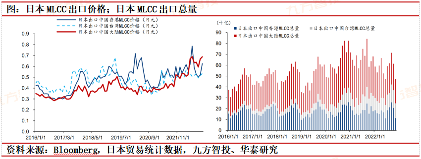 中国市场:中国大陆进口日本MLCC价格(以日元计)在22年11月同比/环比增长34%/3%;