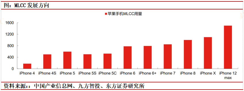 1)终端产品升级:以苹果手机为例,从初代iPhone4MLCC用量177个,到iPhone12maxMLCC用量1500个,单机MLCC用量提升8倍以上。未来MLCC单机使用量有望持续增长。