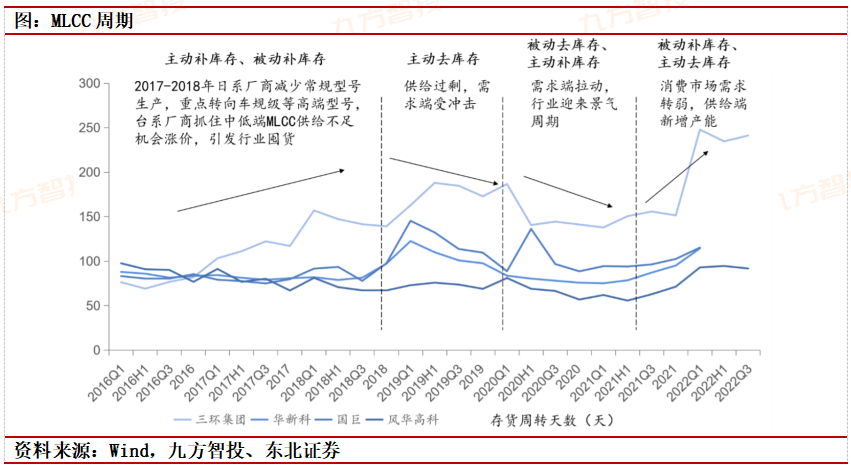 MLCC周期性较为明显,目前正处于周期底部区域,景气度有望好转,即将开启新一轮上行周期。