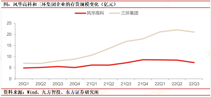 库存端:22Q4国内MLCC厂商存货规模环比均有所下降。国内MLCC厂商风华高科和三环集团2022年Q3末存货水平环比均有所下降,两家公司存货规模相比22Q2均下降约1亿元,表明国内现货库存去化接近尾声。