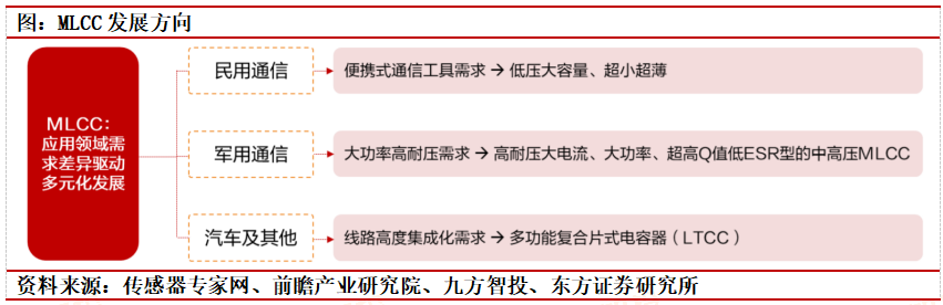 MLCC下游的不同应用领域的需求驱动其多元化发展。随着世界电子信息产业的迅速发展,MLCC在民用通信、军工通信及汽车等领域不断创新迭代,发展方向呈现多元化: