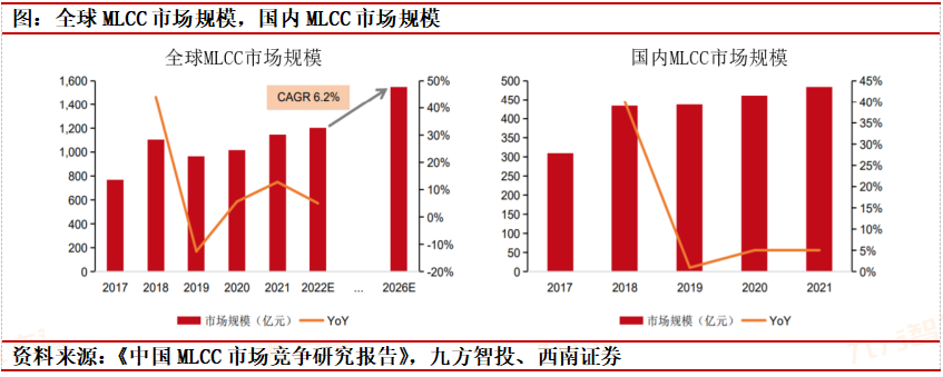根据《中国MLCC市场竞争研究报告》数据,2021年全球MLCC市场规模约1147亿元,预计到2026年市场规模有望增至1547亿元,期间年复合增长率约为6.2%。中国是全球最大的MLCC市场,根据中国电子元件行业协会数据,2021年国内MLCC市场规模约达484亿元,同比增长约5%,市场规模占据全球的40%以上。