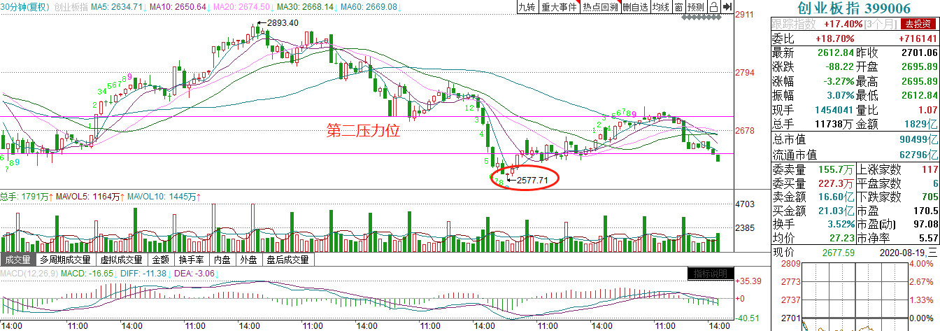 而从创业板指看,此前的走势明显弱于主板,此前我们标注的第二压力位没有过去调头向下,形式不容乐观,今日警惕前低2577附近能否止跌。