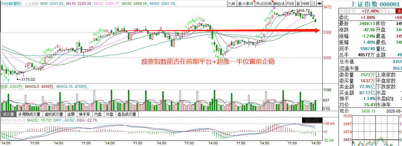 从上证指数看,当前点位在3408,先看3400点整数关口能否守住,5日均线点位在3395点,3395~3400组成了第一道支撑。如果跌幅加深,从上证指数30分钟K线图看,前期平台+这波起涨的一半位置,将是能看到的第二道支撑。