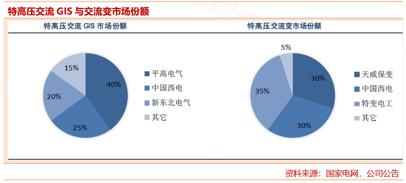 特高压交流项目的核心设备为交流变和GIS,目前在交流变领域,国内的厂商主要是中国西电、特变电工、天威保变,与特高压直流变压器市场竞争格局基本相同。三家厂商在过往中标份额中基本接近。在特高压GIS领域,国内具备研制生产的企业主要为平高电气、中国西电、新东北电气。其中平高电气在GIS设备的竞争中优势较为明显,市场份额占比保持在40%左右。