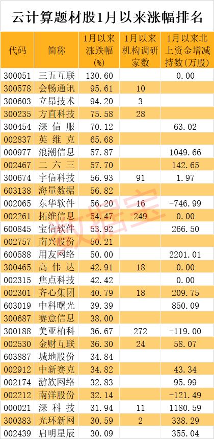 证券时报·数据宝统计显示,1月以来题材股平均涨幅为12.28%,而同期沪指累计下跌4.04%。截至目前,A股云计算题材市值超2万亿元,1月以来累计涨幅在20%以上的共有42只,涨幅最大的是三五互联,1月以来累计涨幅1.31倍。2月11日晚间,三五互联重组预案正式出炉,公司拟购买上海婉锐100%股权,以此切入MCN行业。值得一提的是,上海婉锐主要通过自身的专业化体系孵化网红IP,目前已掌握网红700余个。累计涨幅居前的还有会畅通讯、立昂技术、方直科技、深信服、英维克等。
