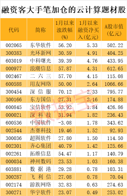 1月以来部分题材股持续获得融资客关注。数据宝统计显示,16股1月至今获融资客净买入超亿元,分别包括东华软件、光环新网、中科曙光、浪潮信息、二六三、用友网络等。东华软件获融资客加仓金额最高,达到5.33亿元。该股今日大涨7.25%,最新收盘价创四年来新高,A股市值重回500亿元以上。