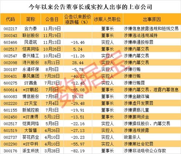 今年以来,A股已有19家上市公司实控人或董事长出事。