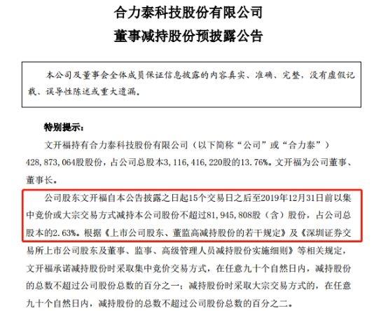 公告称,合力泰董事、董事长文开福拟减持不超过8194.58万股股票,占公司总股本的2.63%。