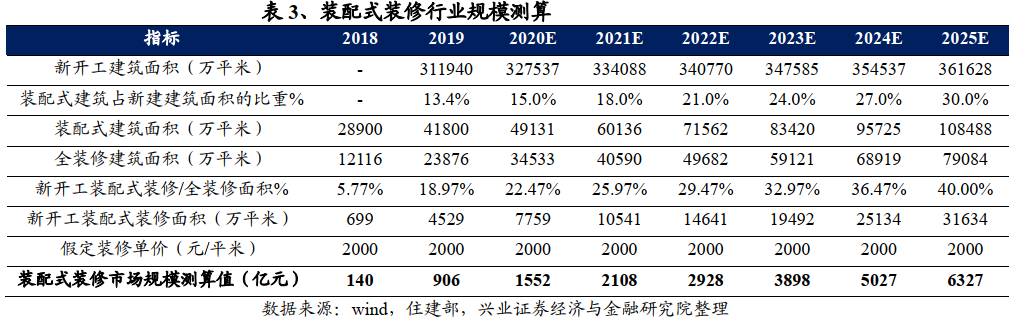 假定每平米的装修单价为2000元,对应2019年装配式装修市场规模906亿元、2020年新开工建筑面积同比增速为5%,21年-25年同比增速为2%,预计2020年装配式装修市场规模将达到1552亿元,2025年将达到6327亿元,年化复合增速38.26%。