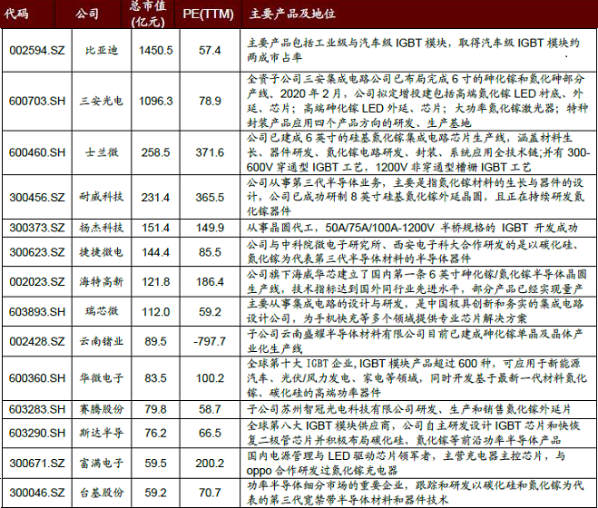 随着IGBT下游的新能源汽车、新能源发电等领域发展迅速,对IGBT模块需求逐步扩大,新兴行业的加速发展将持续推动IGBT市场的高速增长,加上IGBT国产替代需求,我们预计A股市场将诞生一批值得长远投资的企业,以下时我们综合多家券商筛选出几家具有代表性的上市公司。