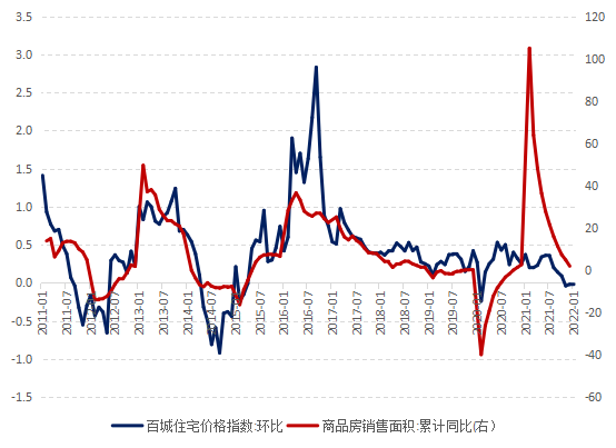 图1 百城住宅价格指数的环比值和商品房销售面积累计同比