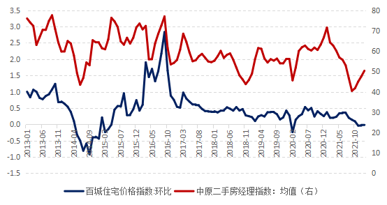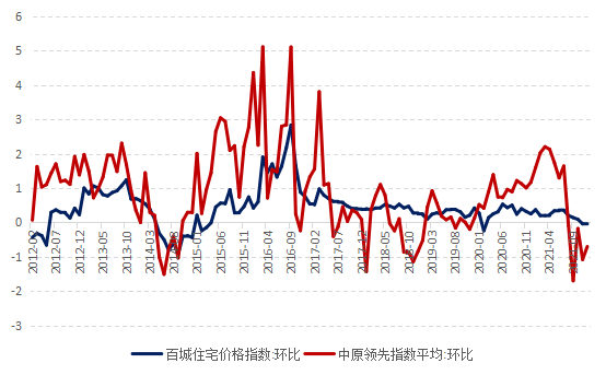 图2 百城住宅价格指数的环比值和中原二手房经理指数(月均值)